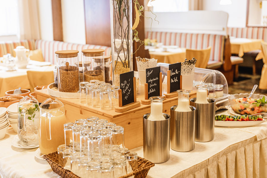 Morgens gibt es ein „G’sund und Vital“-Frühstücksbuffet, mit frisch gepresste Fruchtsäften, hausgemachten Joghurts, „gschmackigen“ Bauerhof-Produkten, eignem Frischkäse u.v.m für einen gesunden Start in den Tag.